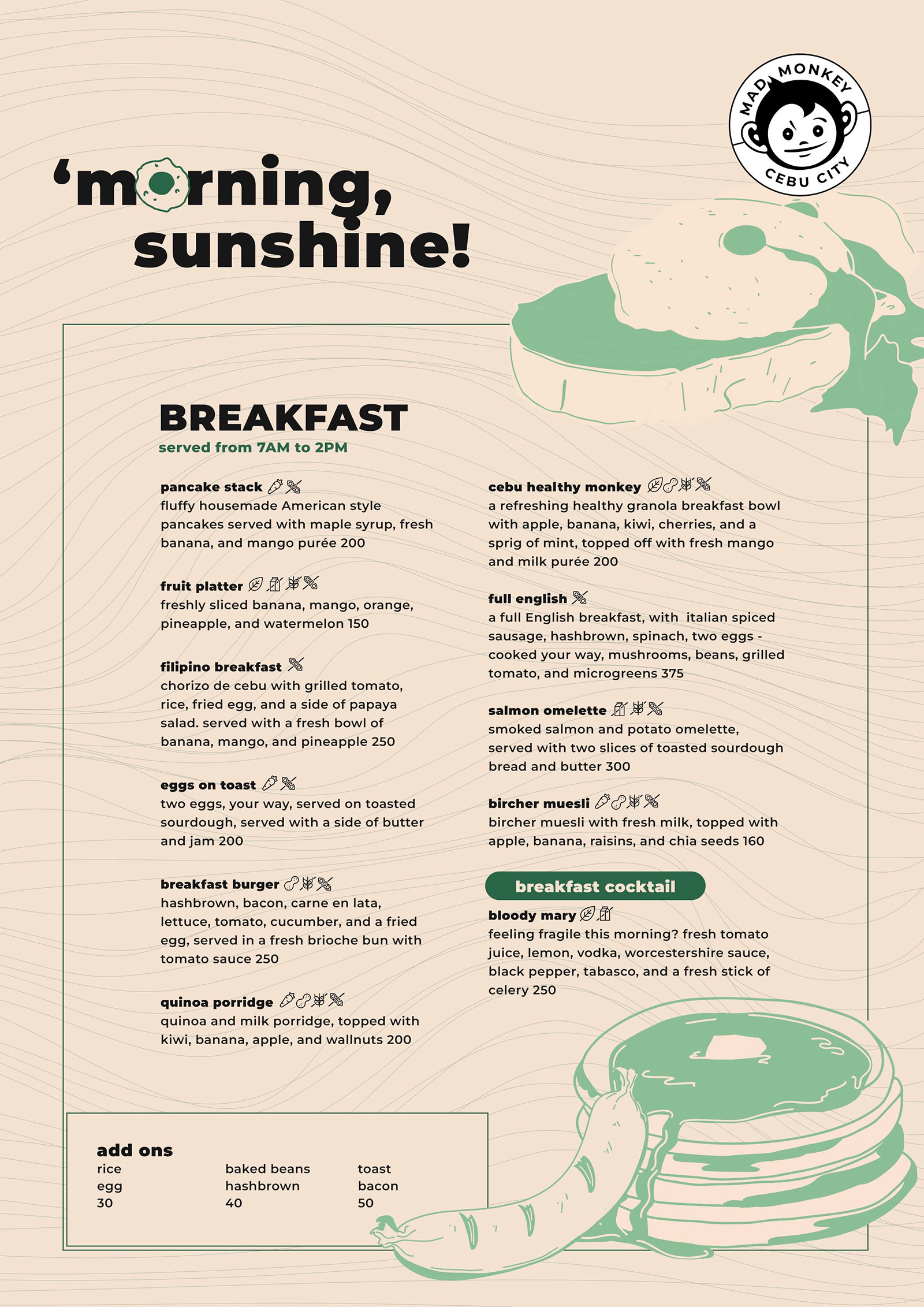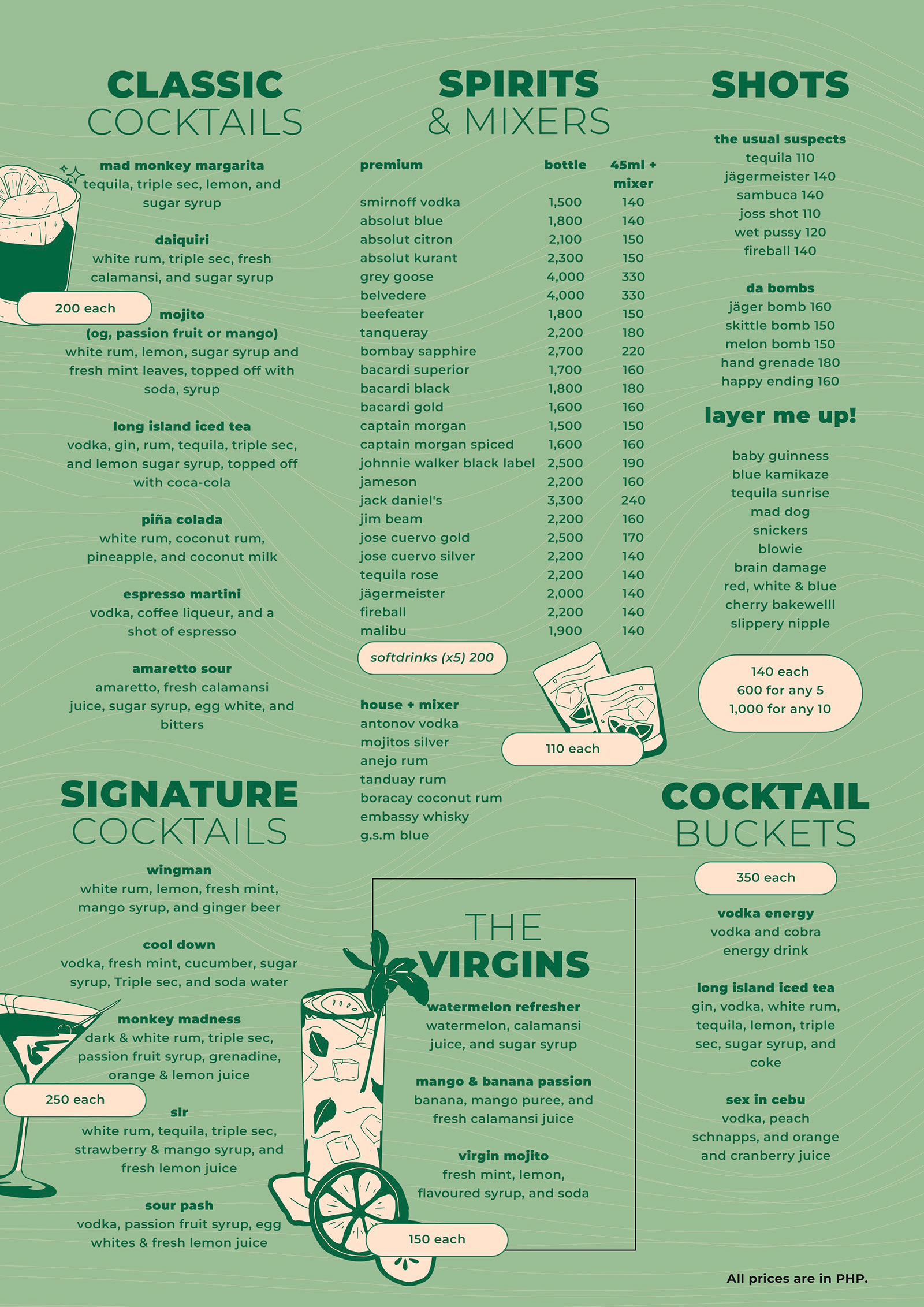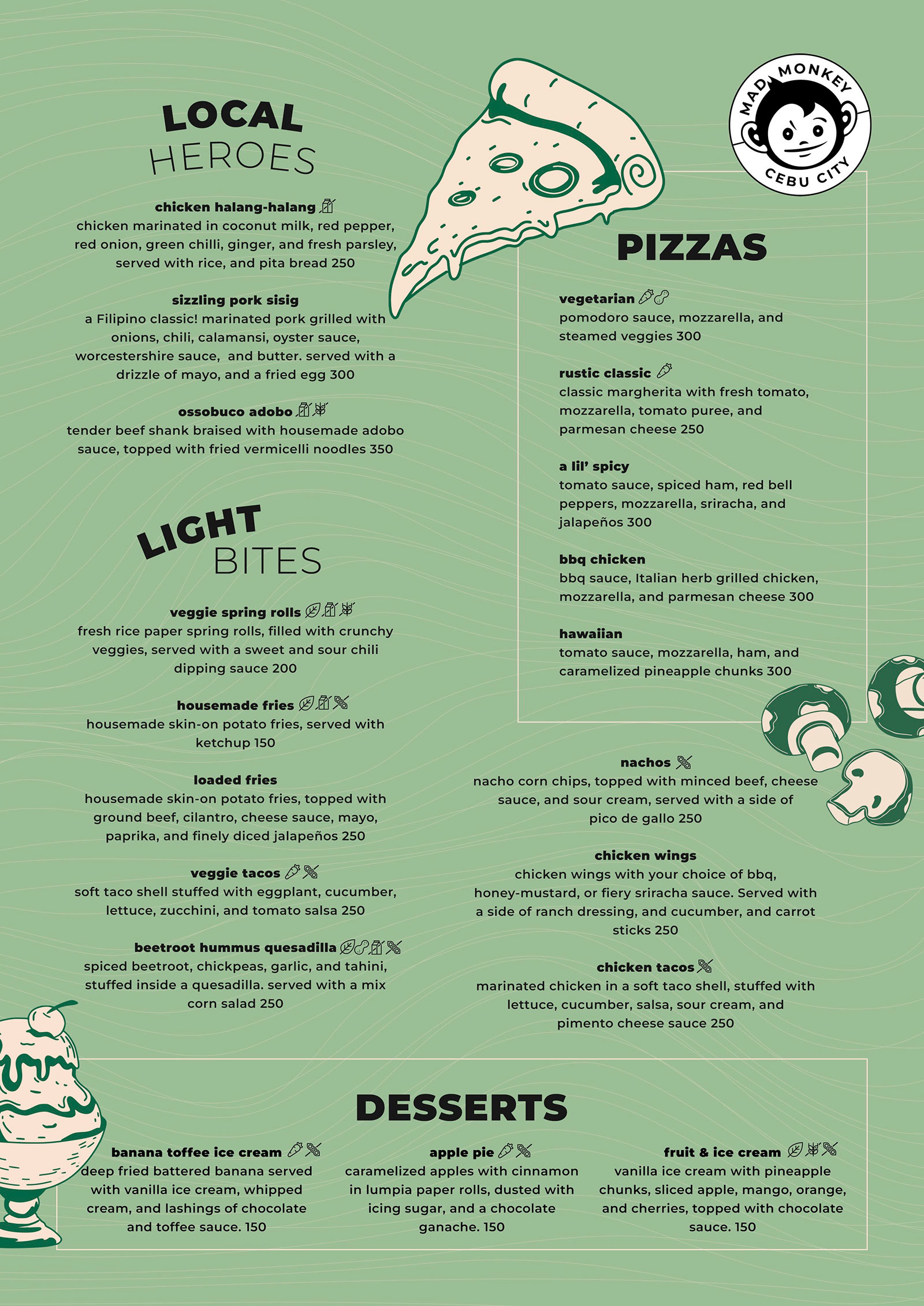 Enjoy an eclectic offering of high-quality international cuisine and local flavors at Mad Monkey Cebu City. From burgers and pastas to your Filipino favorites, sisig and adobo, we’ll be sure to satiate your every craving! BONUS: our bar is also the best place to start your night —listen to your favorite tunes, join in on some drinking games (see our nightly events below!) and meet other travellers from around the world.