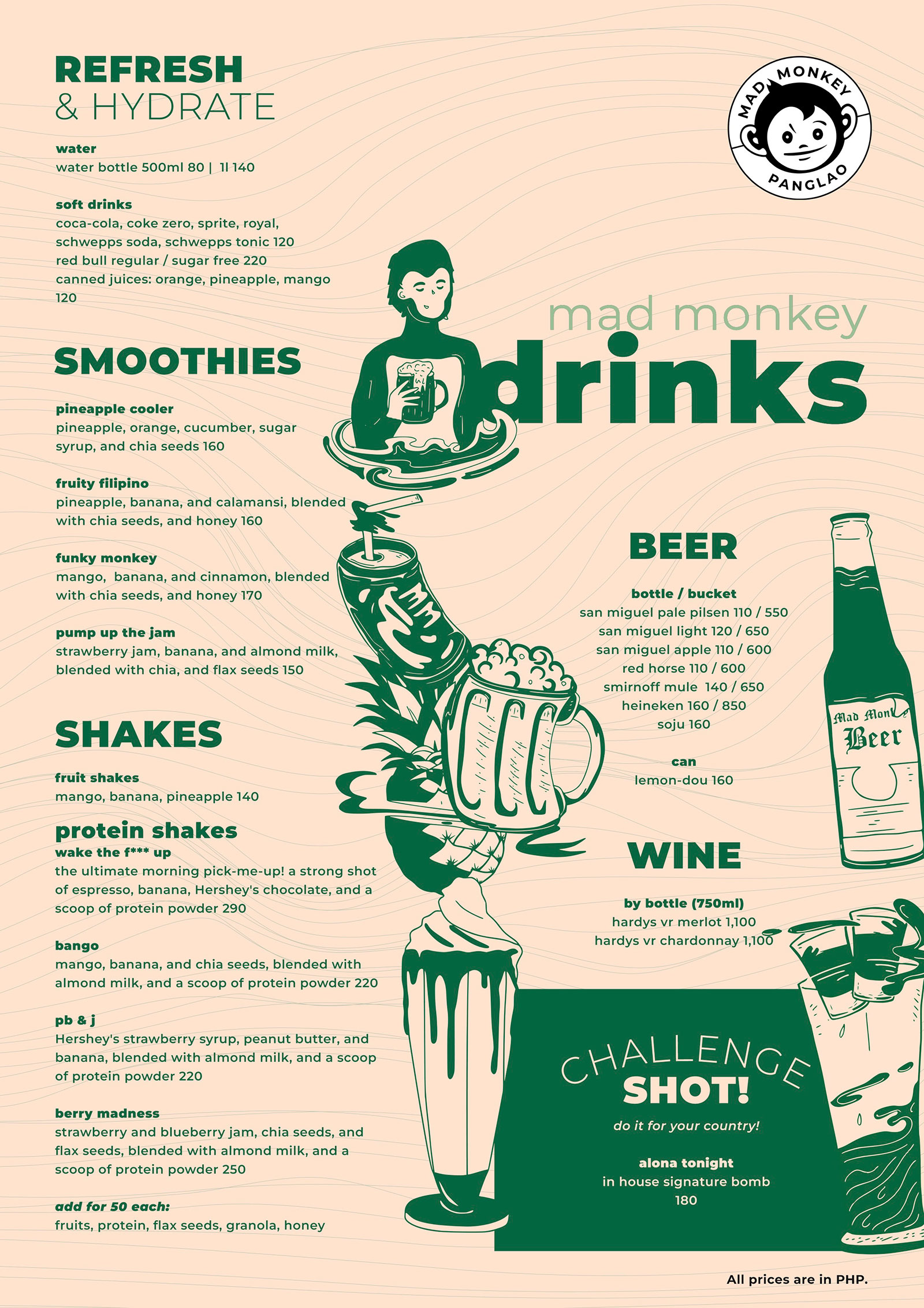 Enjoy a delectable offering of high-quality international cuisine and local flavors at Mad Monkey Siargao. From pastas and pizzas to your Filipino favorites, sisig and halang-halang, we’ll be sure to satiate your every craving! BONUS: our bar is also the best place to start your night — listen to your favorite tunes, join in on some drinking games (see our nightly events below!) and meet other travelers from around the world.
